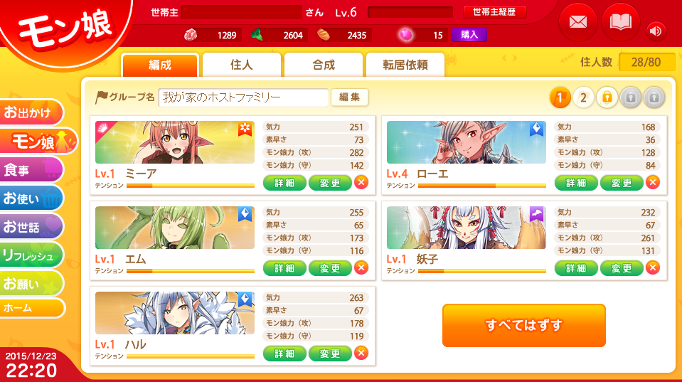 世帯主(モン娘)になりました はお。こいるです。 何かいろいろあって更新が遅れておりました。申し訳ない。 DMMで、ようやく「モンスター娘のいる日常オンライン」がサービス開始となりました。 メインメンバーはアニメ絵だけど、追加メンバーは描き下ろしなのでワクワクが押し寄せてきますね。 とりあえずリセマラは無しの方向で、HRの妖子さん(九尾)をゲット。 その他いろいろやって現在6LVくらいの新米世帯主です。 こんな感じでお気に入りを5人まで選べます。 上からラミア族ミーア(本編ヒロインその1)、オーガ族ローエ(でかくて臆病)、エンプーサ族エム(偽Sキャラ豆腐メンタル)、九尾族妖子(京町系お狐様)、ハーピィ族ハル(クールビューティ) 一番好きなのはローエさんです(真顔)。 あとは金の鎖追ったり、モンスター狩ったり、いろいろやってます。いろいろやりすぎて更新の時間がががが(緊急停止)